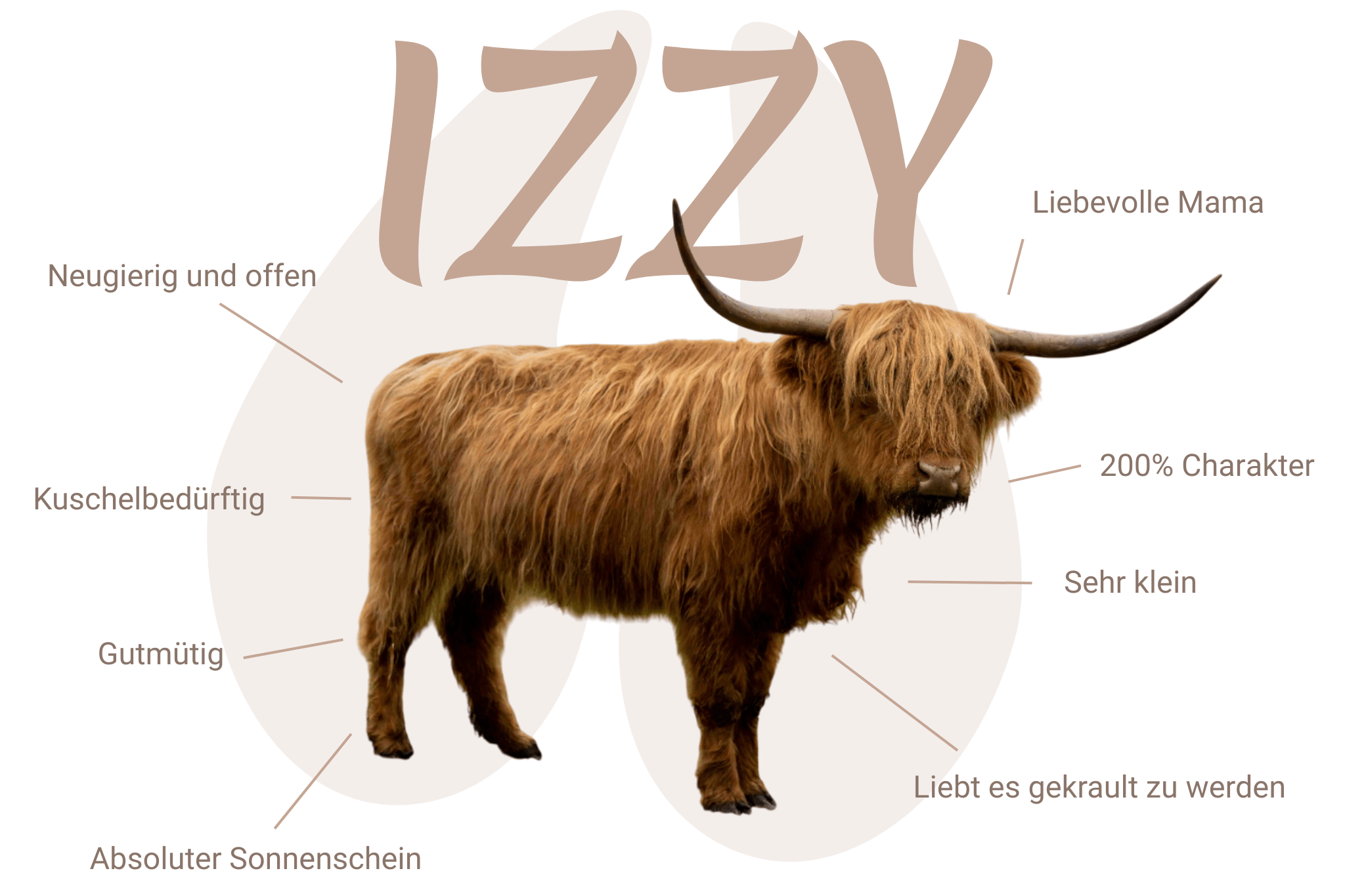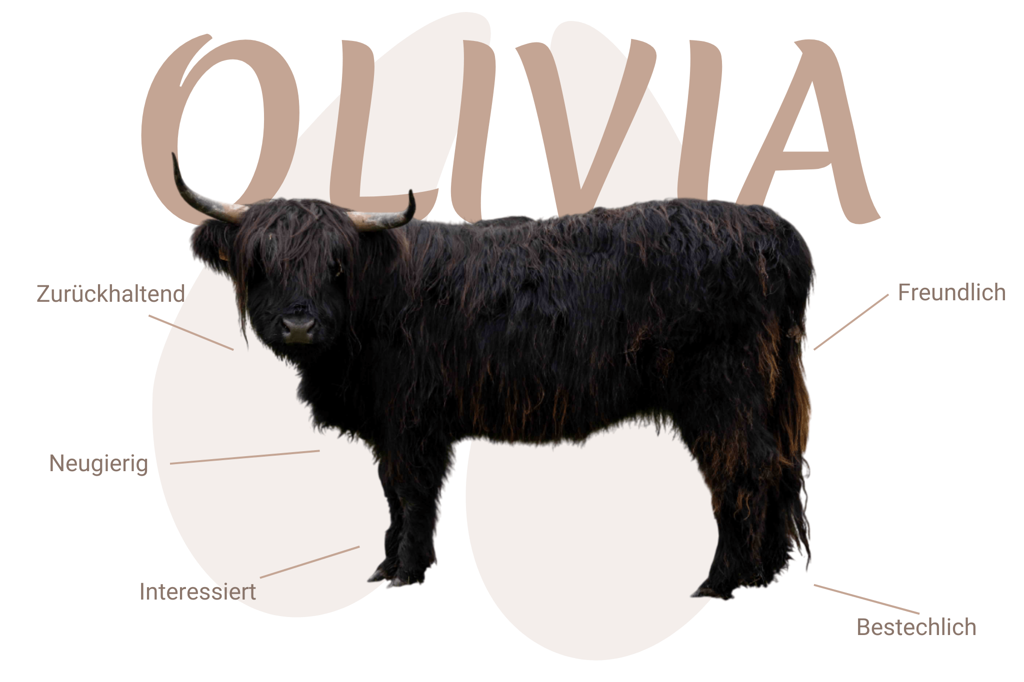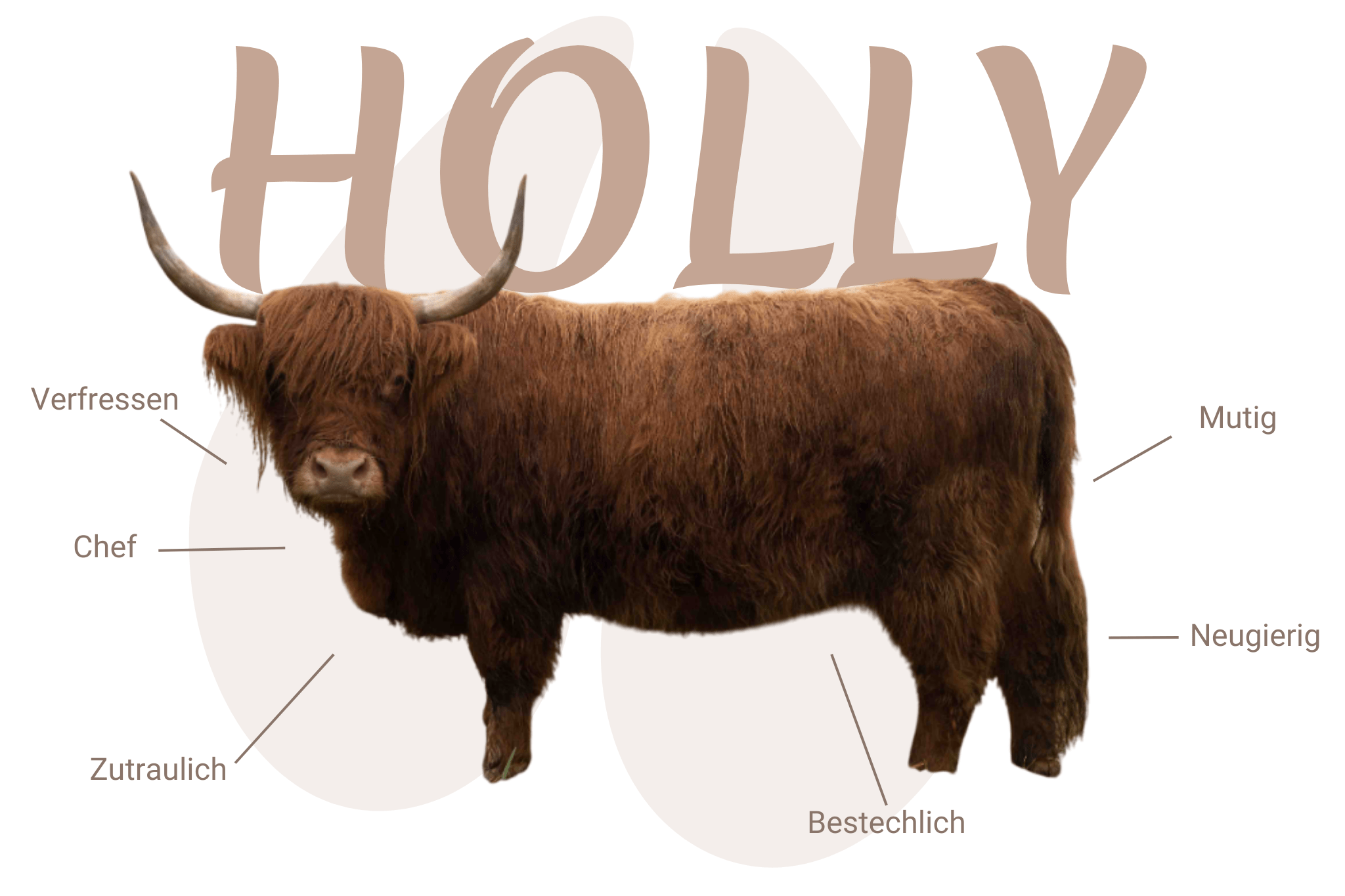 Unsere Highlander werden momentan in zwei Herden gehalten. In der Hauptherde läuft unser Leihbulle Ruadhri mit seinen Damen über rund zwei Hektar Fläche. In der zweiten Herde stehen unsere Teenie-Mädels, also alle Färsen, die aufgrund ihre Alters noch nicht gedeckt werden dürfen. Fürs nächste Jahr ist eine dritte Herde mit einem blutsfremden Bullen geplant. Die Liebe zu unseren Tieren spiegelt sich in ihren zutraulichen Charakteren. Trotzdem hat jedes Herdenmitglied seinen ganz eigenen und besonderen Charakter. Die wichtigsten Eigenschaften unserer treuen Wegbegleiter sehen Sie auf den Bildern stichpunktartig zusammengefasst.