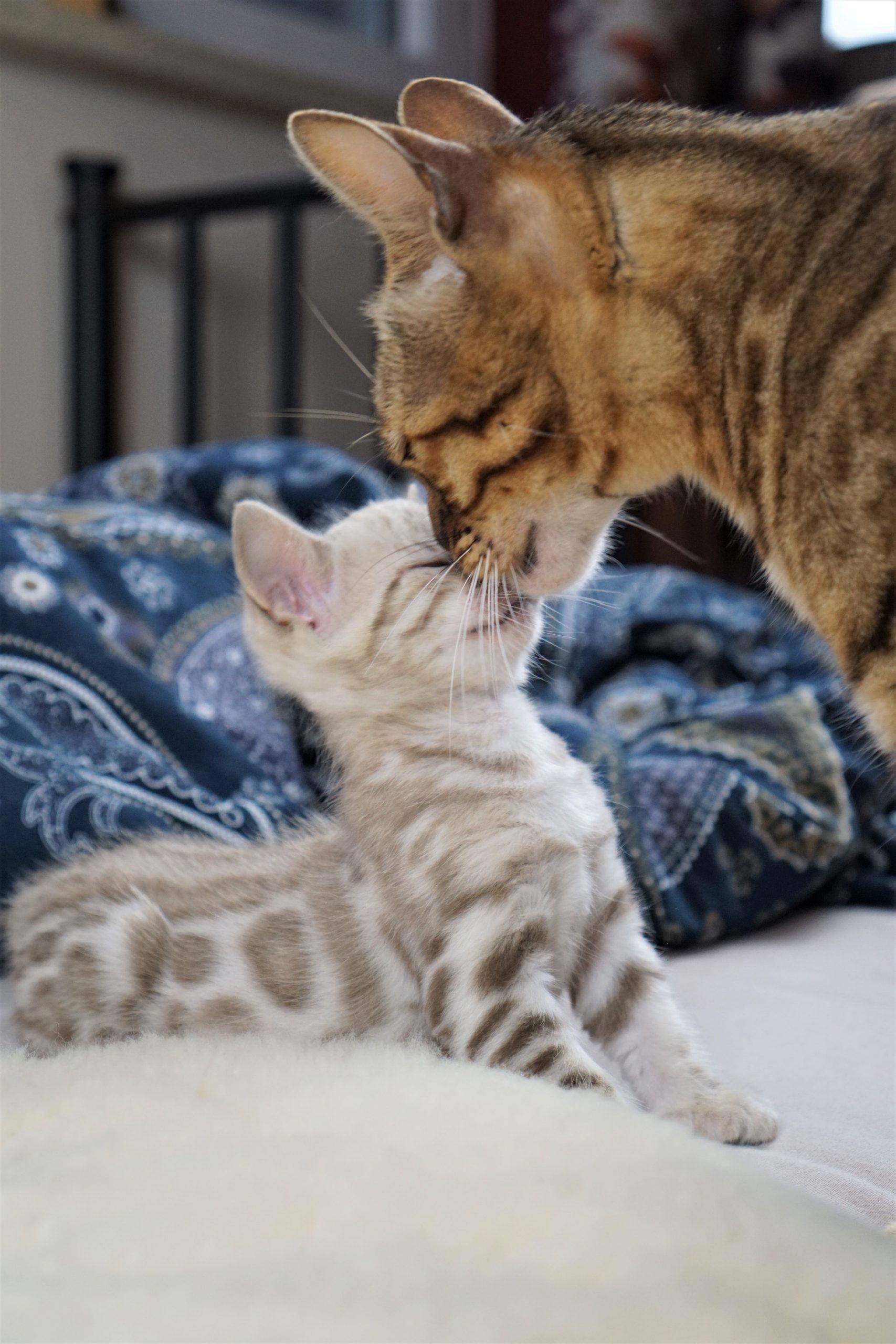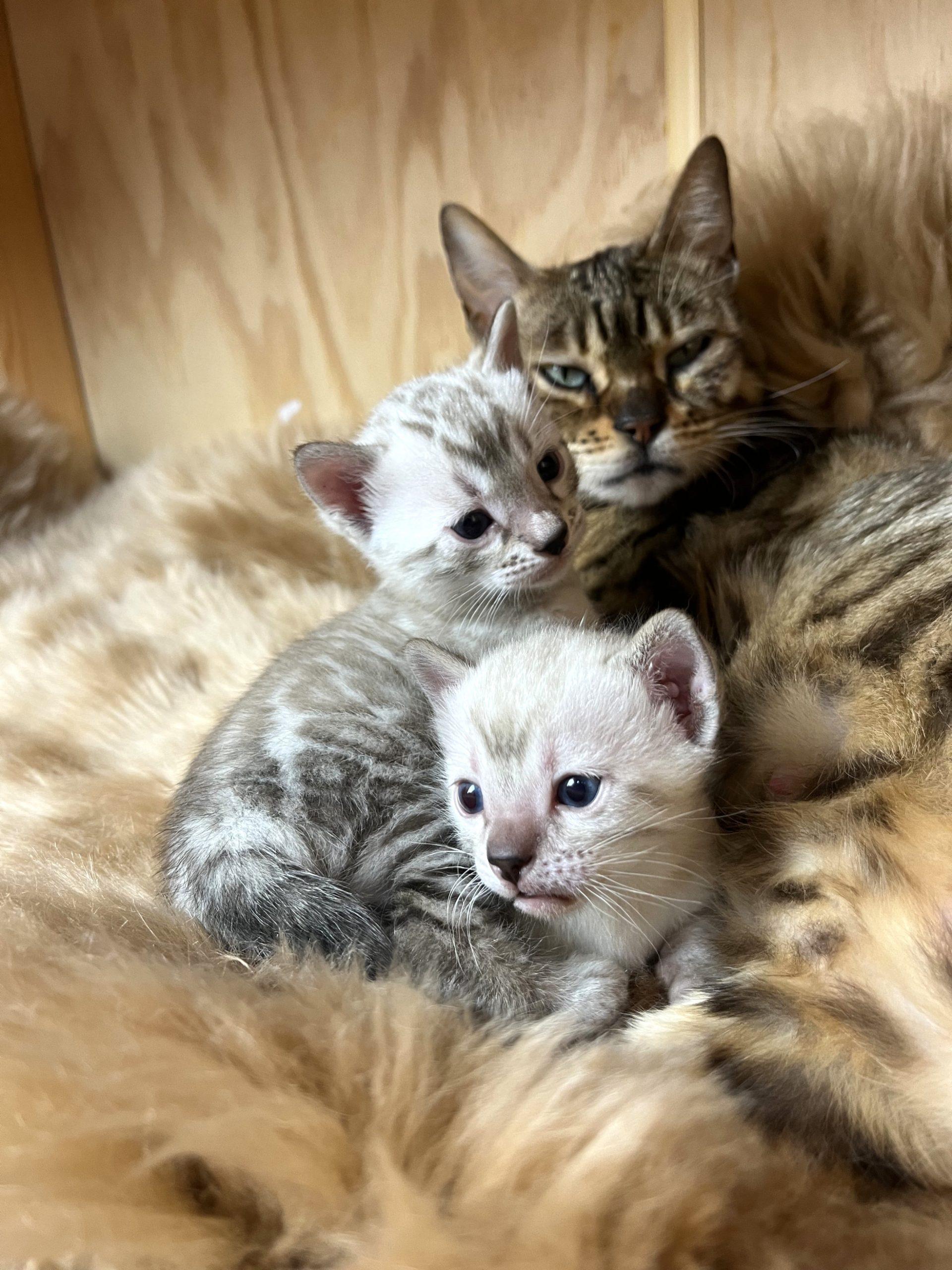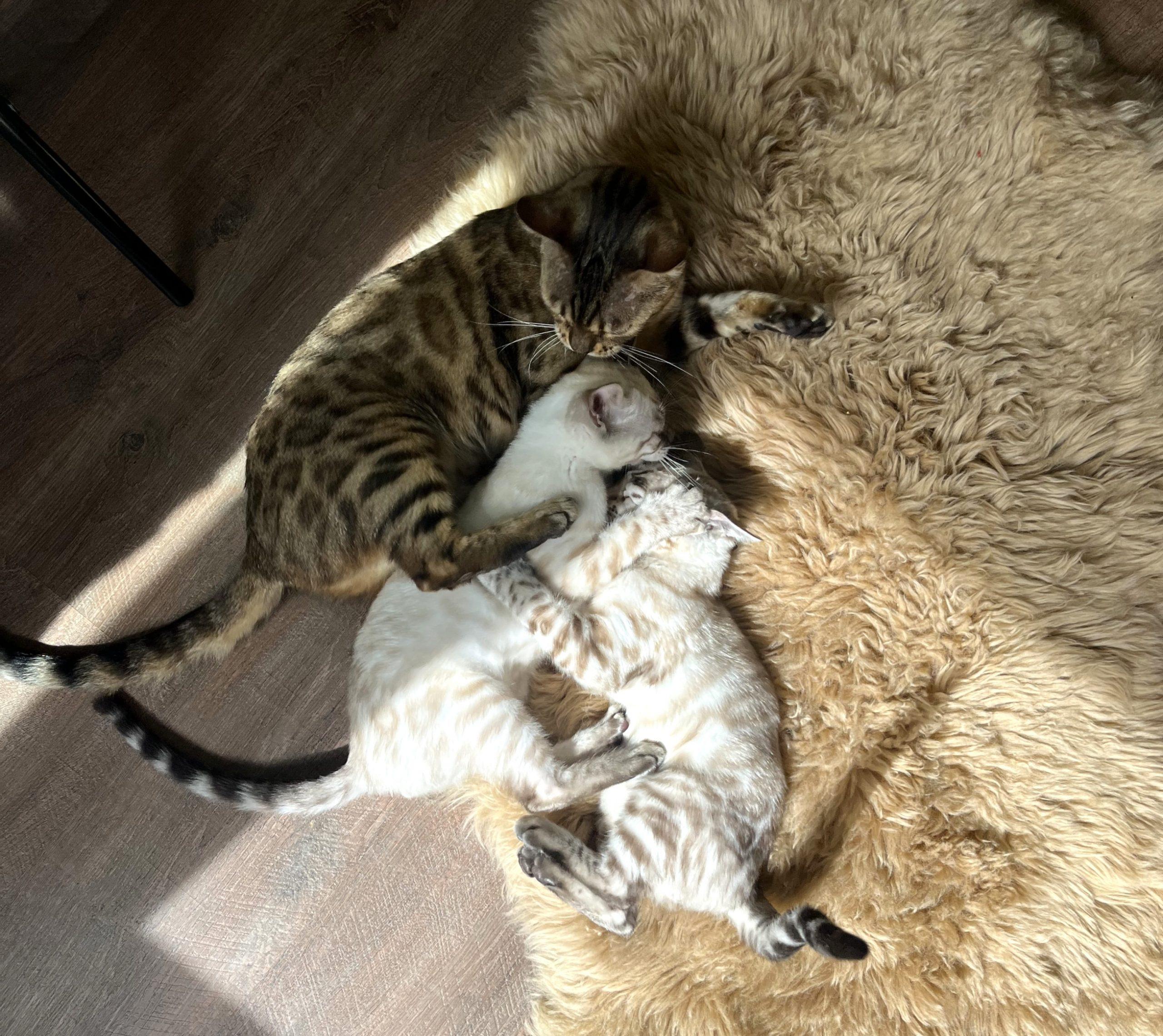 Ihr erster Wurf bestand aus 5 Kitten und ihr zweiter Wurf aus 2 Kitten, die sie liebevoll, aber auch bestimmt aufzog.